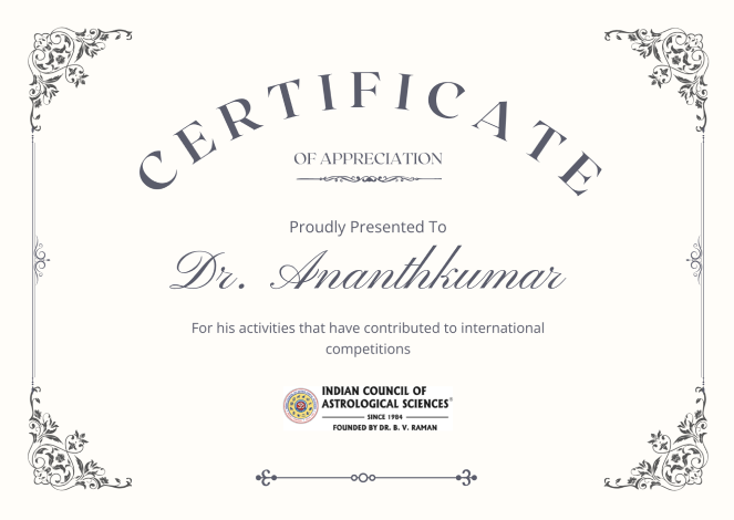 Dr. Ananthkumar has been awarded a Certificate of Appreciation by the Indian Council of Astrological Sciences (ICAS), an esteemed institution founded in 1984 by Dr. B.V. Raman. This honor was presented in recognition of his valuable contributions to international astrological competitions and activities. His dedication and active engagement have helped promote Indian astrological knowledge on global platforms. ICAS is widely respected for its role in standardizing astrological education and recognizing exceptional talent in the field. Dr. Ananthkumar’s recognition underscores his commitment to excellence and his ongoing efforts in advancing the science of astrology internationally.