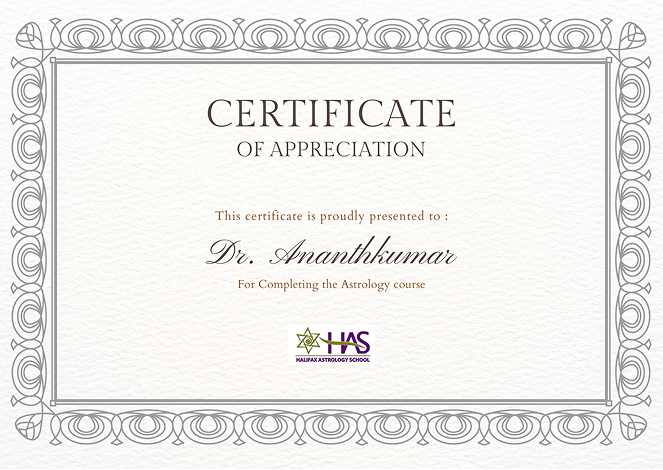 Dr. Ananthkumar has been honored with a Certificate of Appreciation by Halifax Astrology School for the successful completion of their astrology course. This achievement reflects his commitment to deepening his knowledge and understanding of astrological sciences. The program provided a comprehensive overview of astrological techniques, predictive systems, and chart analysis. Halifax Astrology School is known for its structured curriculum and focus on practical, spiritual, and theoretical aspects of astrology. Dr. Ananthkumar’s dedication to continuous learning enhances his ability to offer meaningful guidance through astrological wisdom.