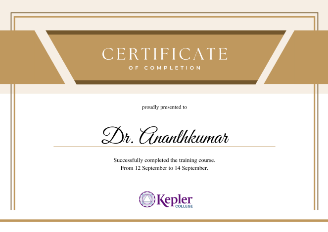 Dr. Ananthkumar has successfully completed a specialized training course at Kepler College, a globally recognized institution for astrological studies. The training took place from 12th to 14th September and focused on practical and theoretical aspects of modern astrology. Through this program, he deepened his understanding of astrological techniques, chart interpretation, and celestial patterns. Kepler College is known for its rigorous curriculum and scholarly approach to astrology. With this certification, Dr. Ananthkumar continues to blend traditional wisdom with modern astrological insight to guide and empower individuals on their life paths.