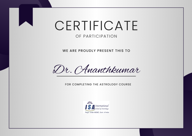 Dr. Ananthkumar has been awarded a Certificate of Participation by the International School of Astrology (ISA), recognized under MSME, Government of India. This certification acknowledges his successful completion of a structured astrology course designed to build strong foundational skills. Through this program, he gained insights into horoscope analysis, planetary combinations, and predictive techniques rooted in Vedic tradition. ISA is widely respected for its commitment to quality education in astrology and other metaphysical sciences. Dr. Ananthkumar’s achievement reflects his dedication to continuous learning and spiritual growth in the field of astrology.
